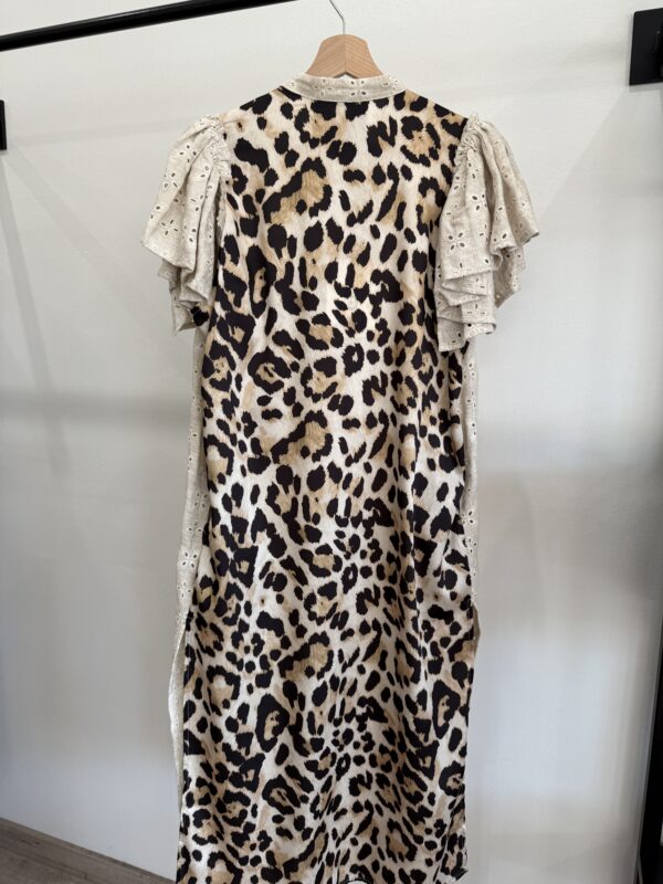 Abito in San Gallo aperto sul davanti con patch applicati. Manica corta con volant. Tessuto di raso, stampa macula, sul dietro.