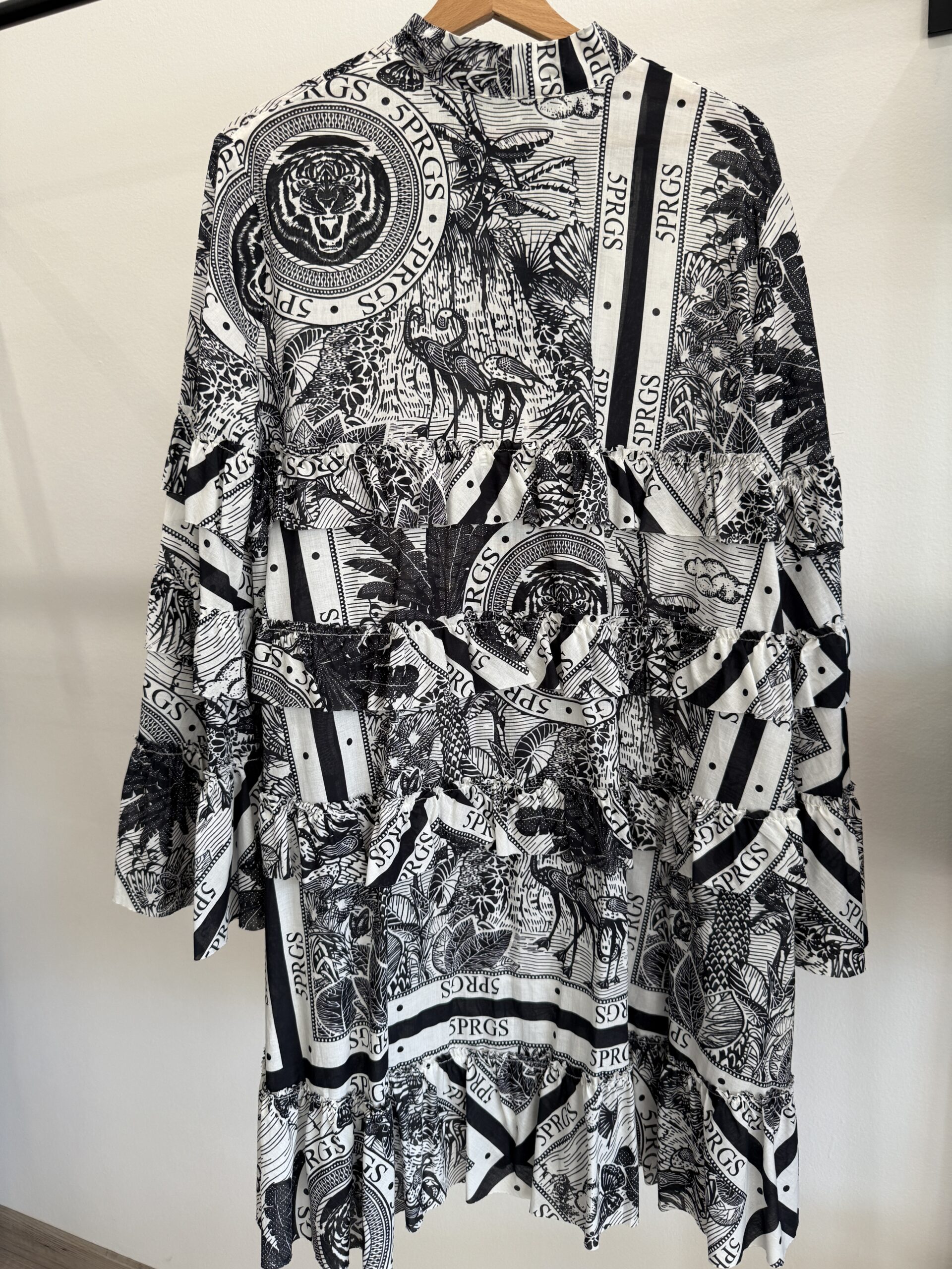 Abito corto in mussola di cotone con volant, anche sulle maniche, aperto sul davanti. Collo con sciarpetta. Stampa Eden Garden.