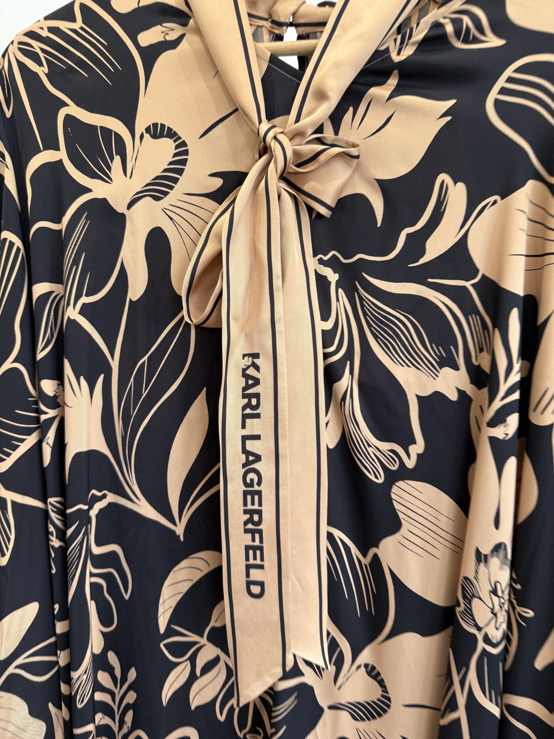 Abito maxi con orlo asimmetrico e maniche lunghe decorate con l’iconico logo KARL LAGERFELD. L’elegante cravatta aggiunge un tocco di raffinatezza, perfetta per occasioni festive. Chiusura posteriore con bottoncino. Un design in edizione speciale, incarna la celebrazione e lo stile.