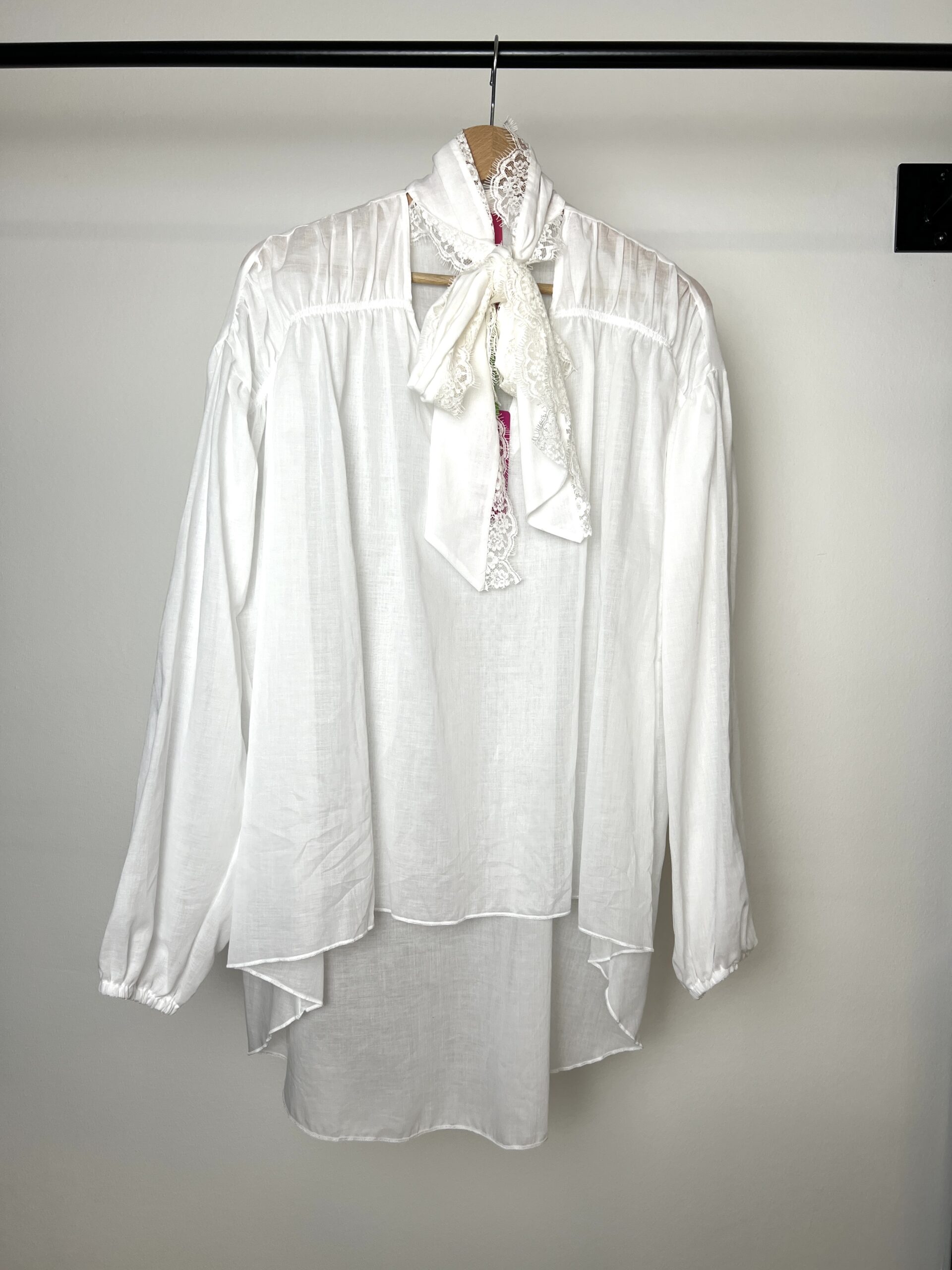 Camicia in mussola di cotone con sciarpetta bordata con pizzo francese. Carré sul davanti con elastico arriccio. Linea over. Più lunga sul dietro. Manica ampia con elastico al polso.