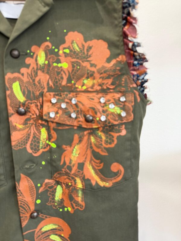 Camicia smanicata, verde militare, dipinta a mano, con applicazioni di strass sulle tasche. Bottoni lavorati, in metallo. Volantino di tessuto multicolore nel giro manica.