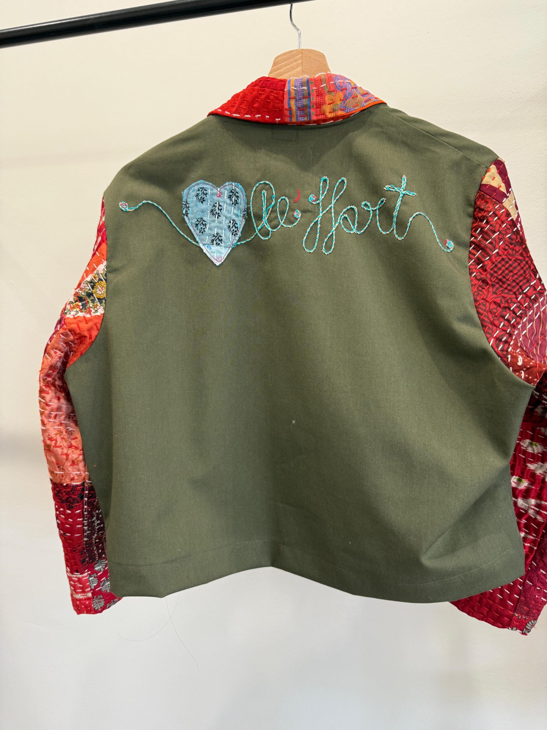 Giacca corta a linea dritta con collo a scialle in seta rossa, ricamato a mano. Il davanti è in cotone verde militare. Chiusura con bottone a cuore. Tasche applicate sul davanti con alamaro. Maniche in tessuto di seta ricamato. Scritta dipinta sulla parte posteriore.