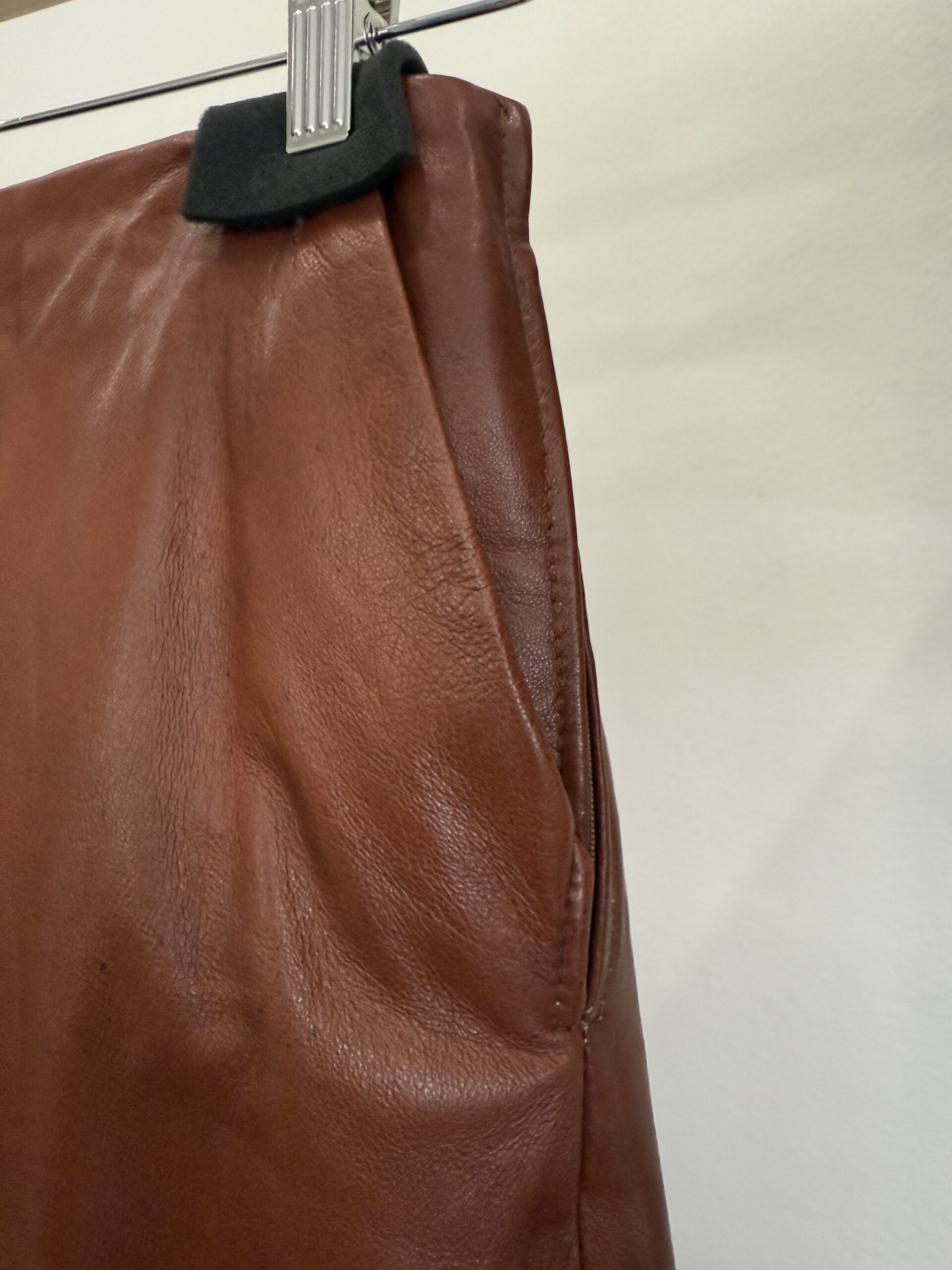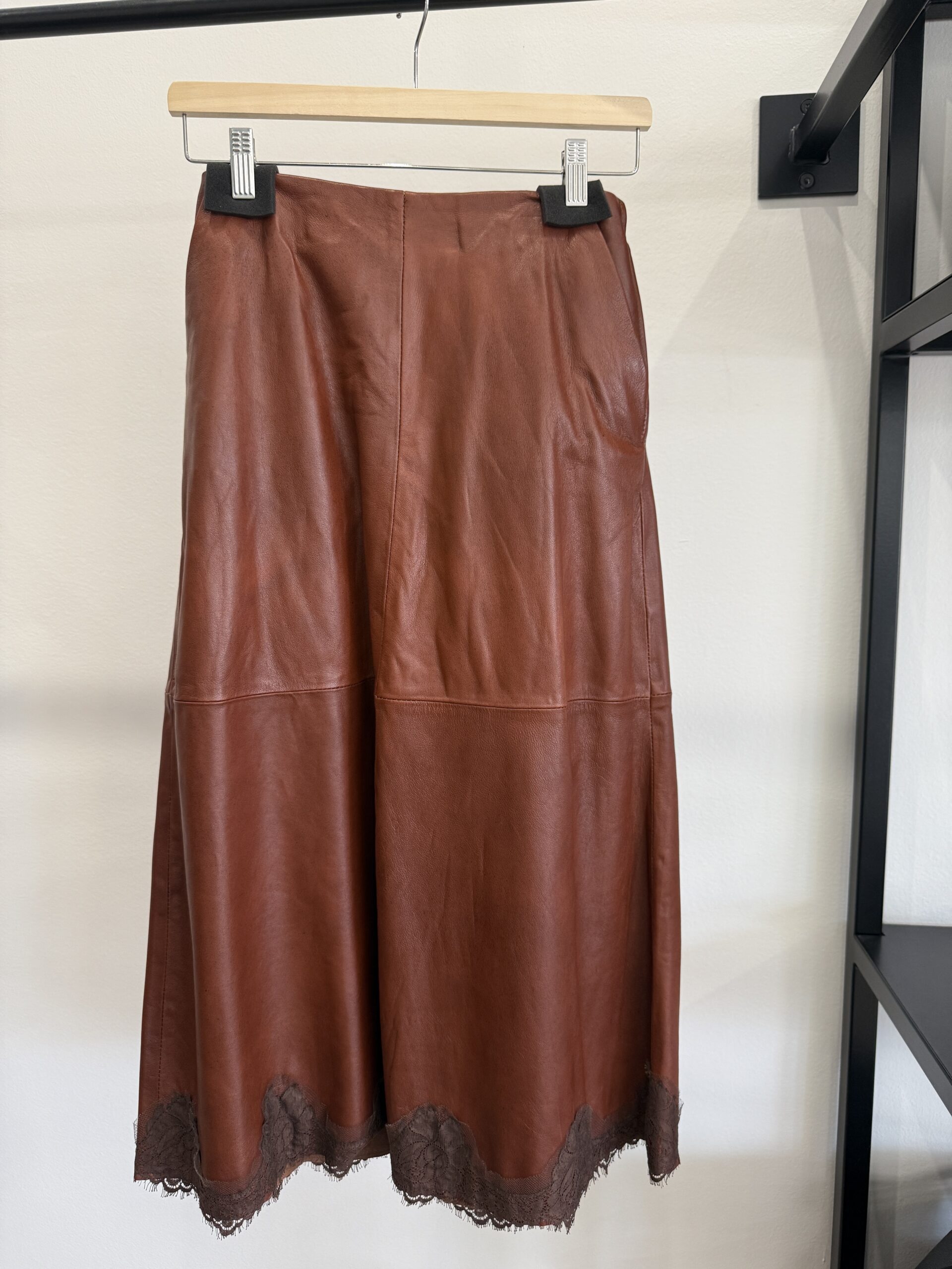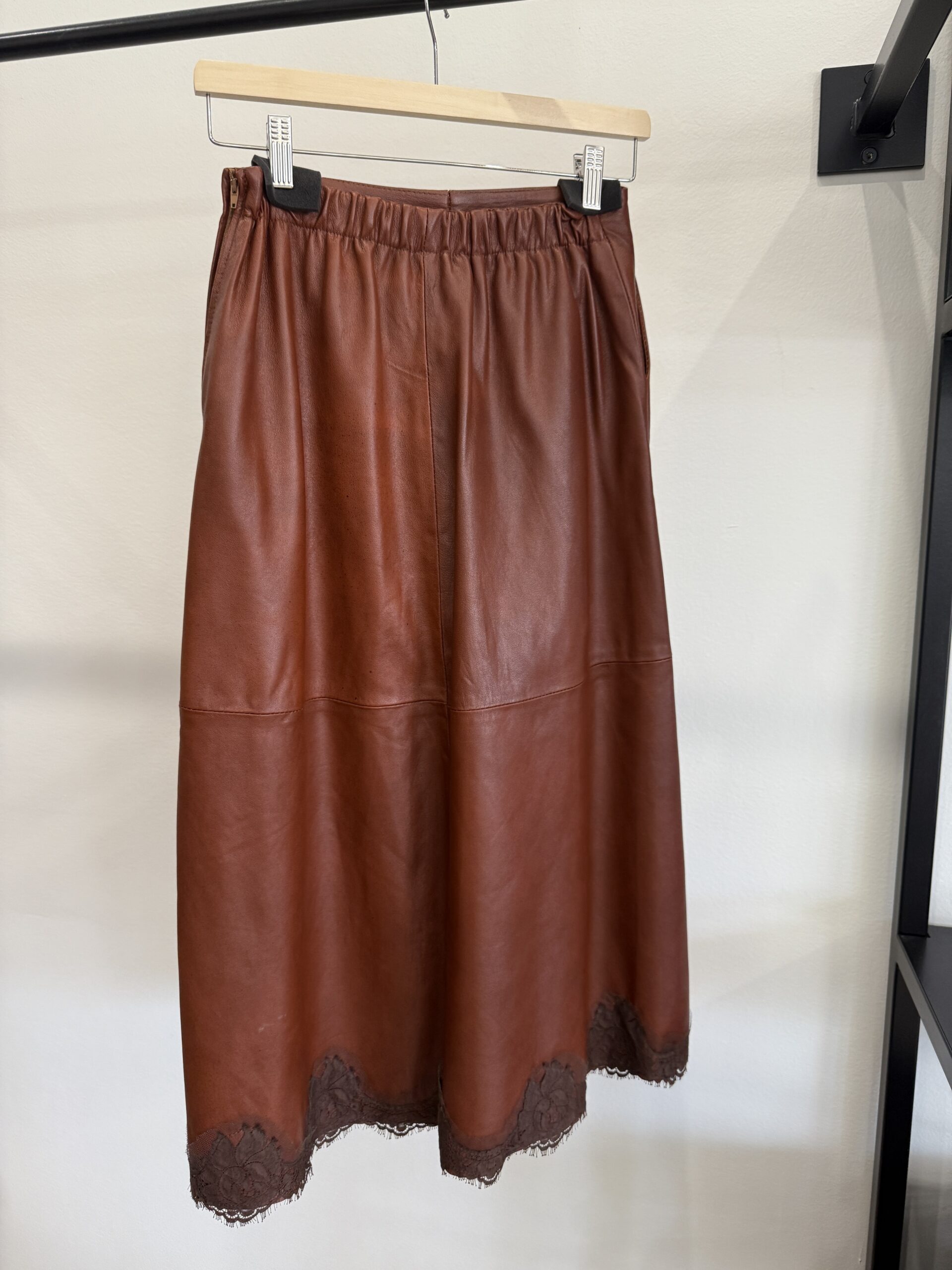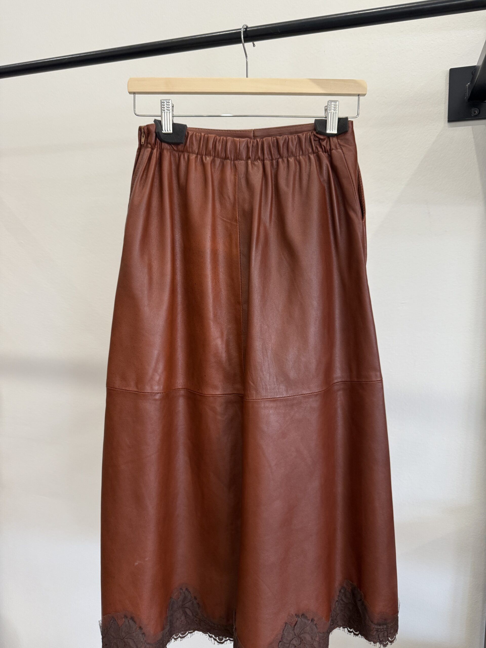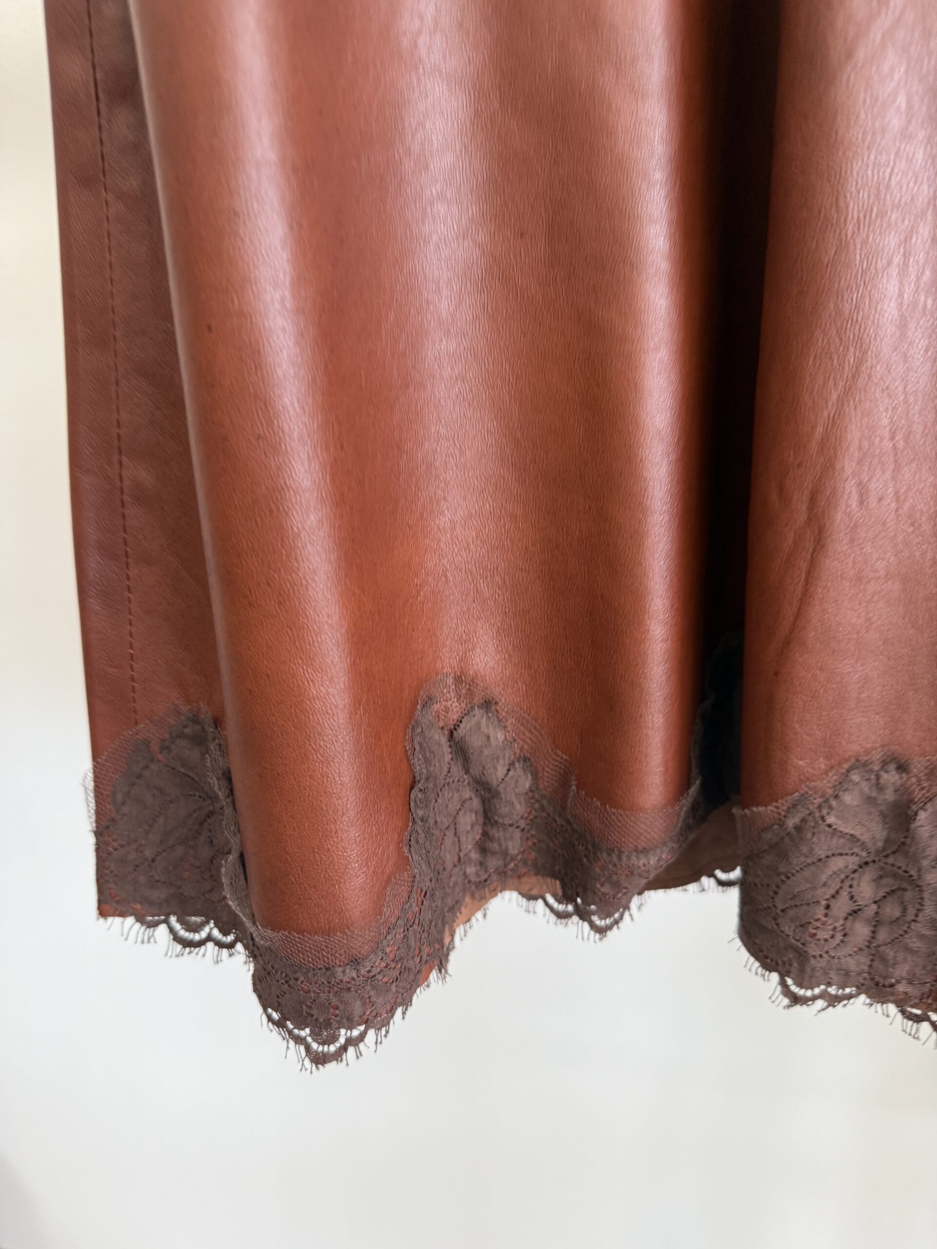 Gonna in pelle con rifinitura in pizzo nel fondo, elastico nel cinturino posteriore e zip. 100% Made in Italy.